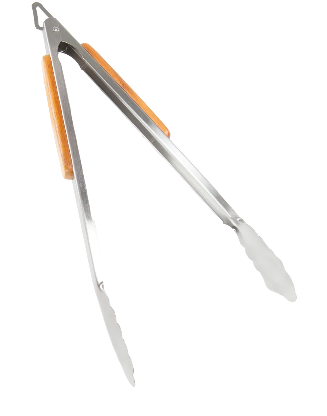 Convenient locking mechanism fastens the tongs closed for easy storage.